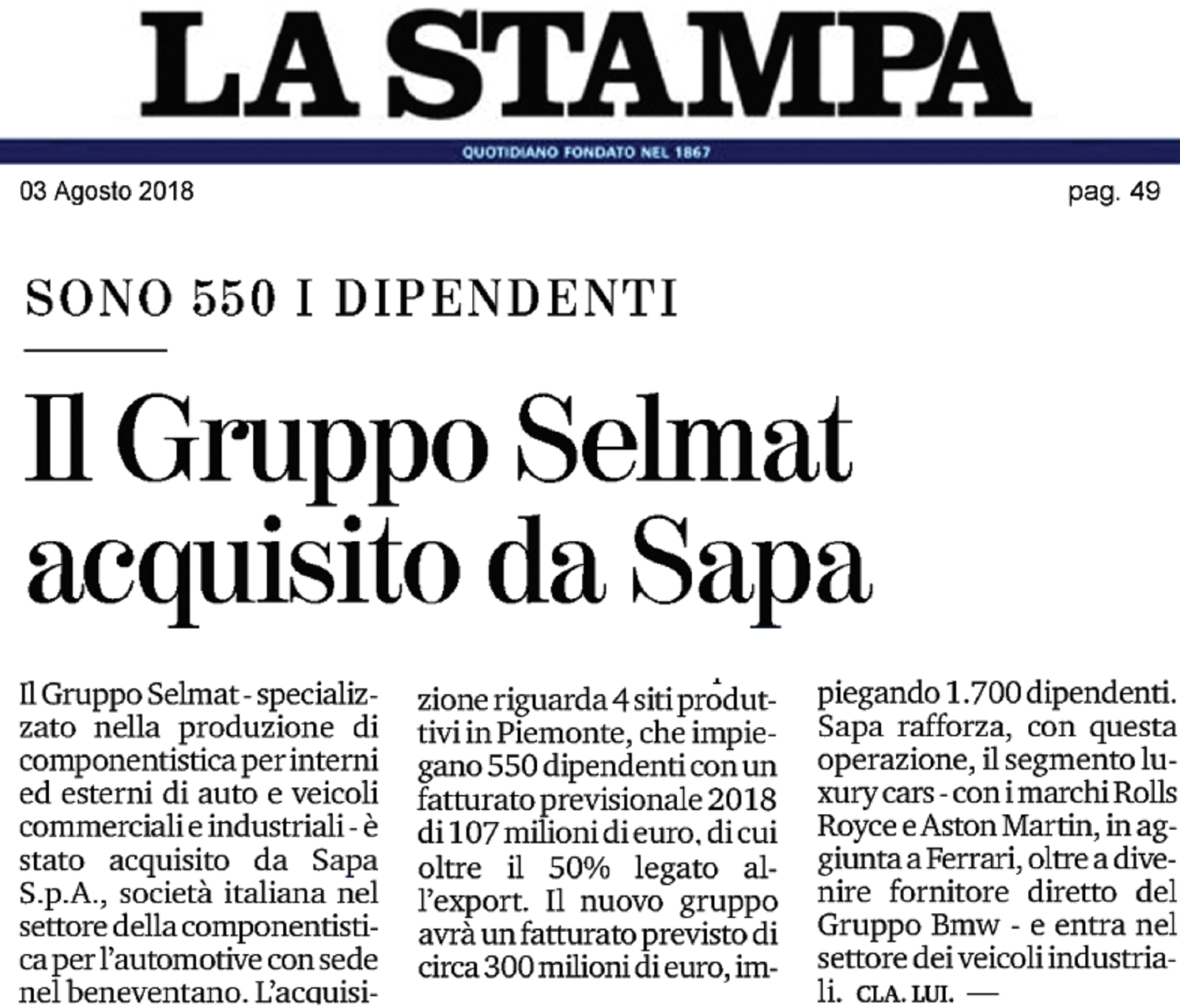 [Rassegna stampa] SAPA acquisisce il gruppo Selmat: ecco la notizia sulle più grandi testate